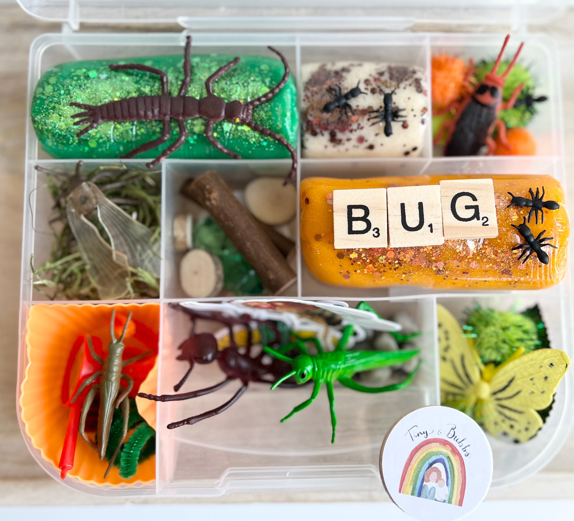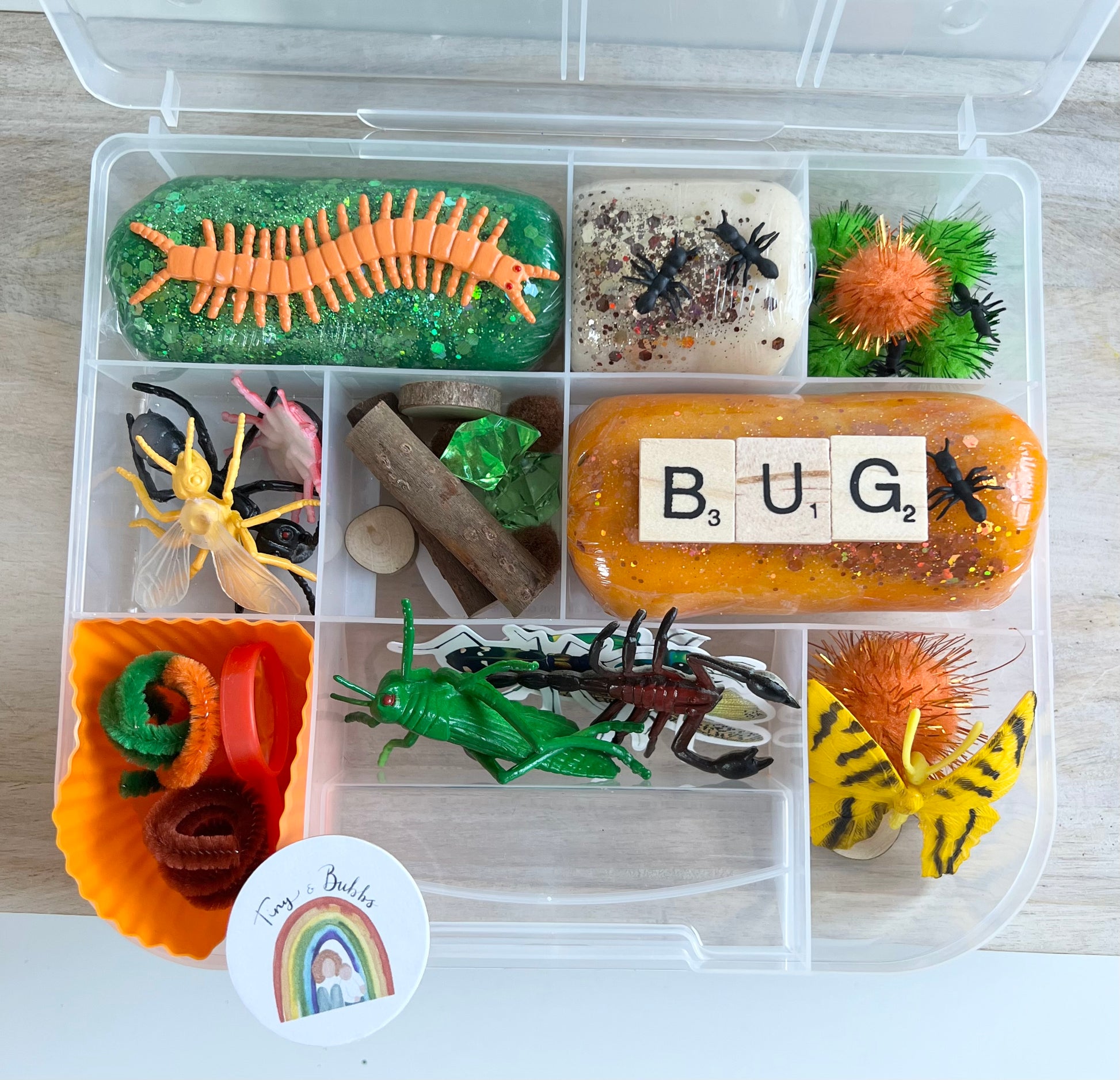 Inside, you'll find: π Three different colors of playdough for endless creative possibilities π Multiple bug figurines to spark imagination and discovery π A mini magnifying glass for up-close bug investigations π Themed letter tilesΒ π¨ Bug stickers to decorate the kit container and add a personal touch π§© Multiple manipulatives for creating and playing, ensuring hours of fun